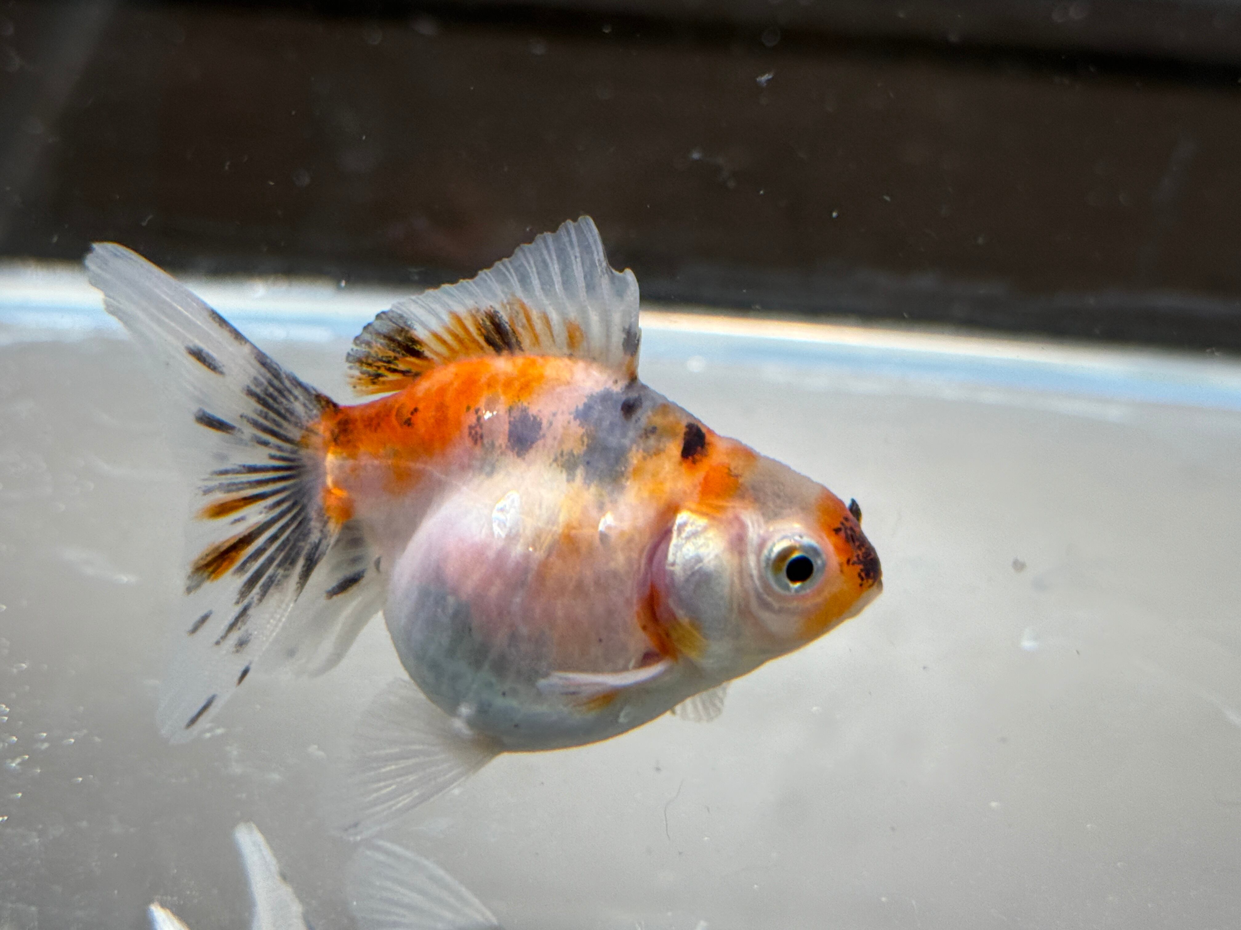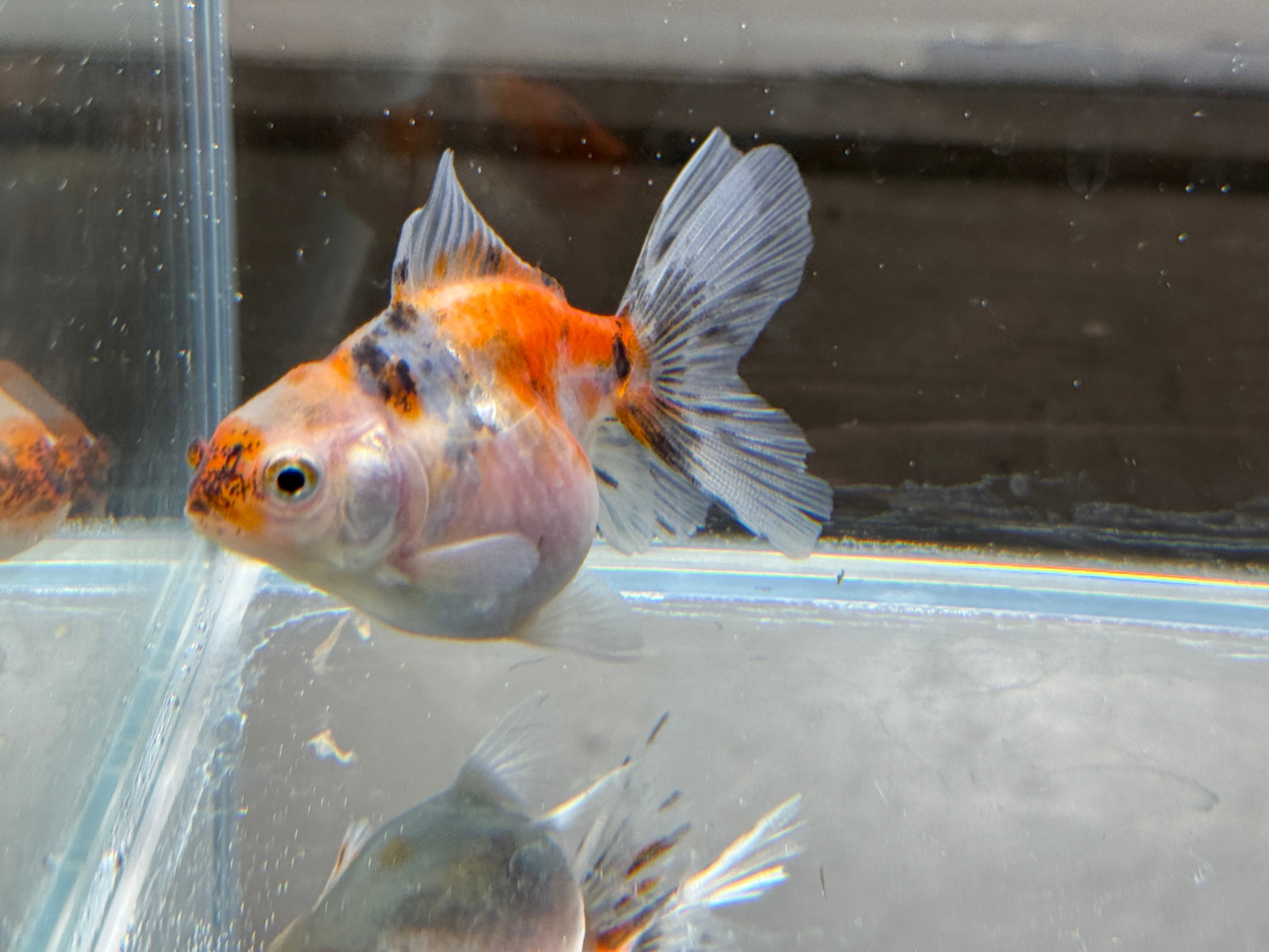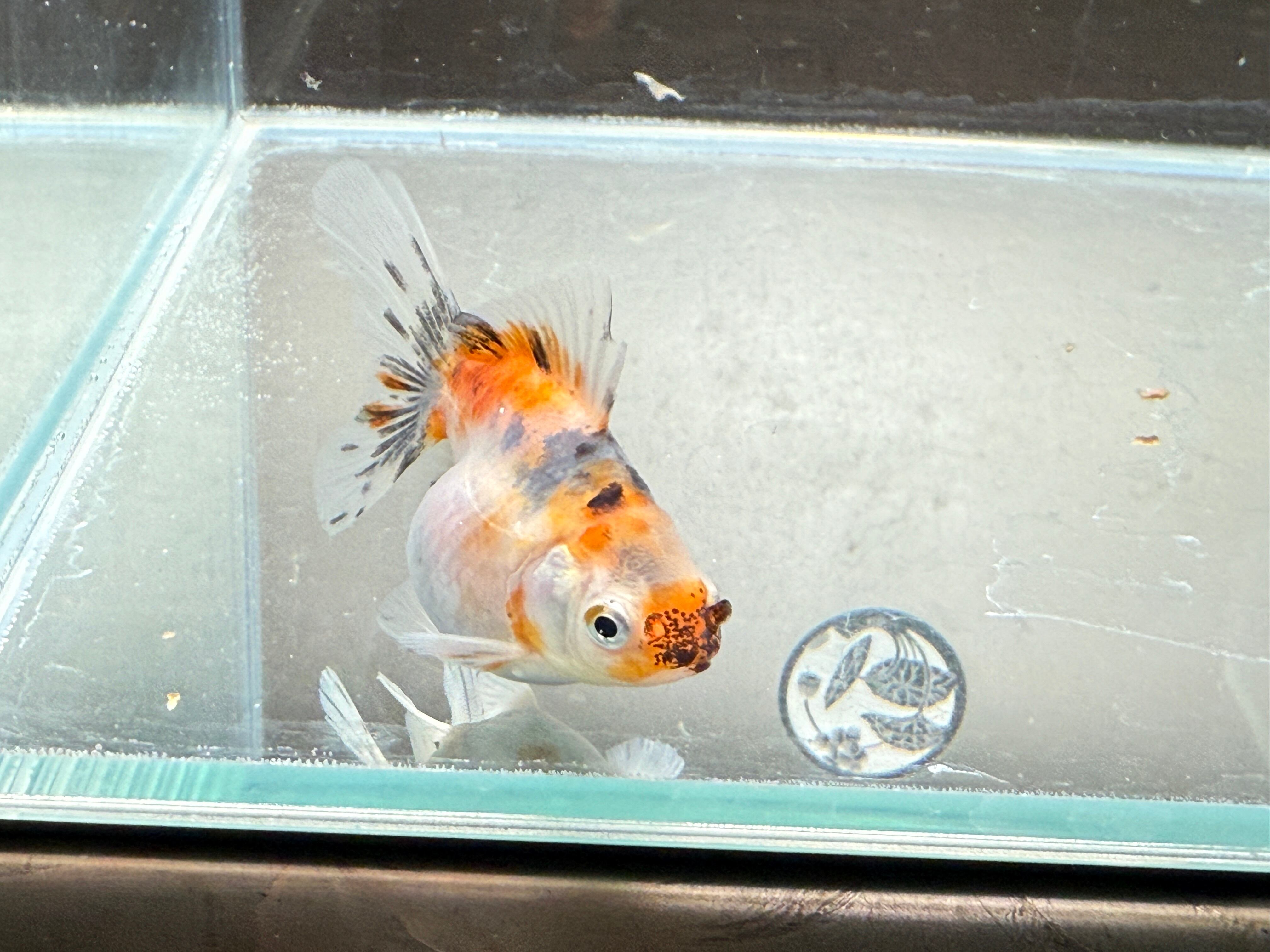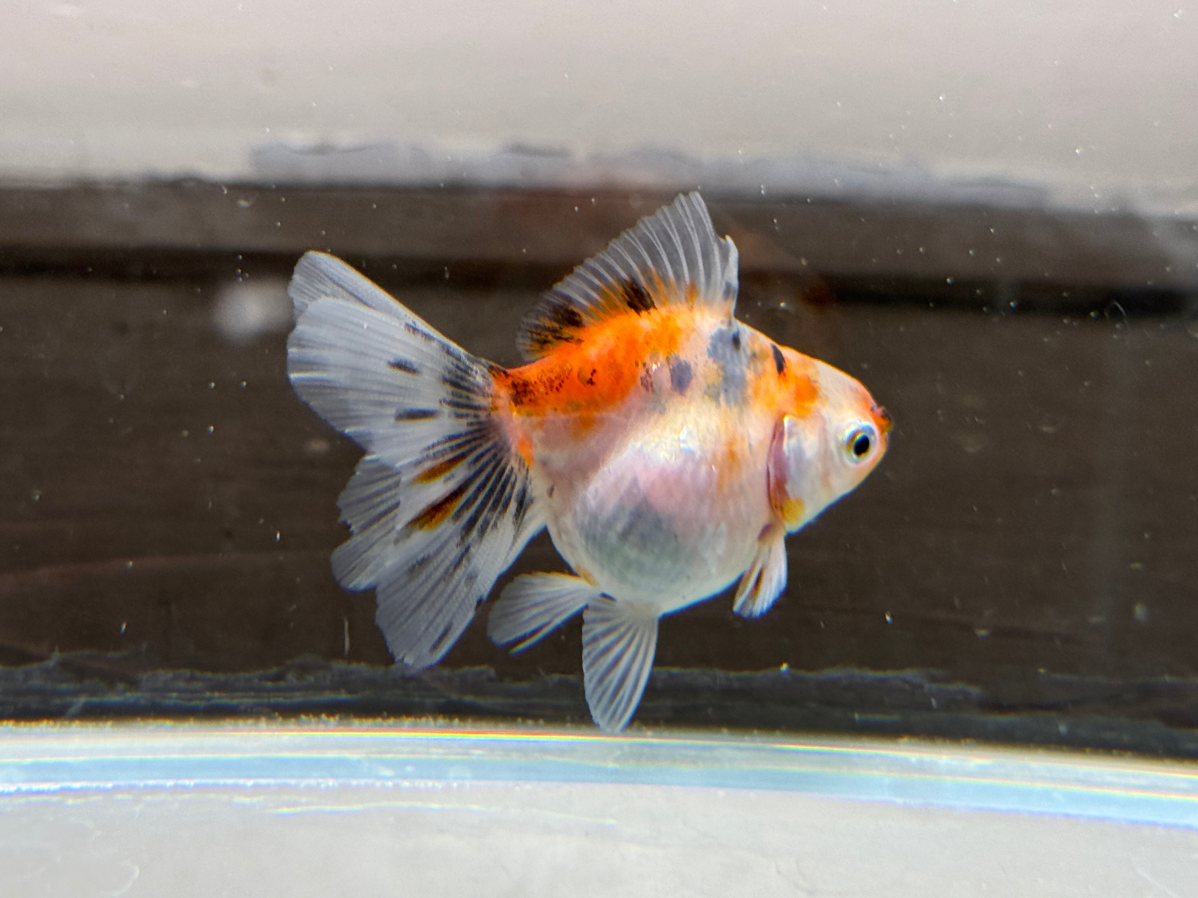 白勝ちの爽やかな東錦。しっかり立ち上がった大きな尾鰭にすでにドレープが見えますので、成長したら大変美しいローズテールになると思います。達磨体型にしっかり大きな尾鰭が乗っていますが泳ぎも安定していてとても美しい佇まいの子です。