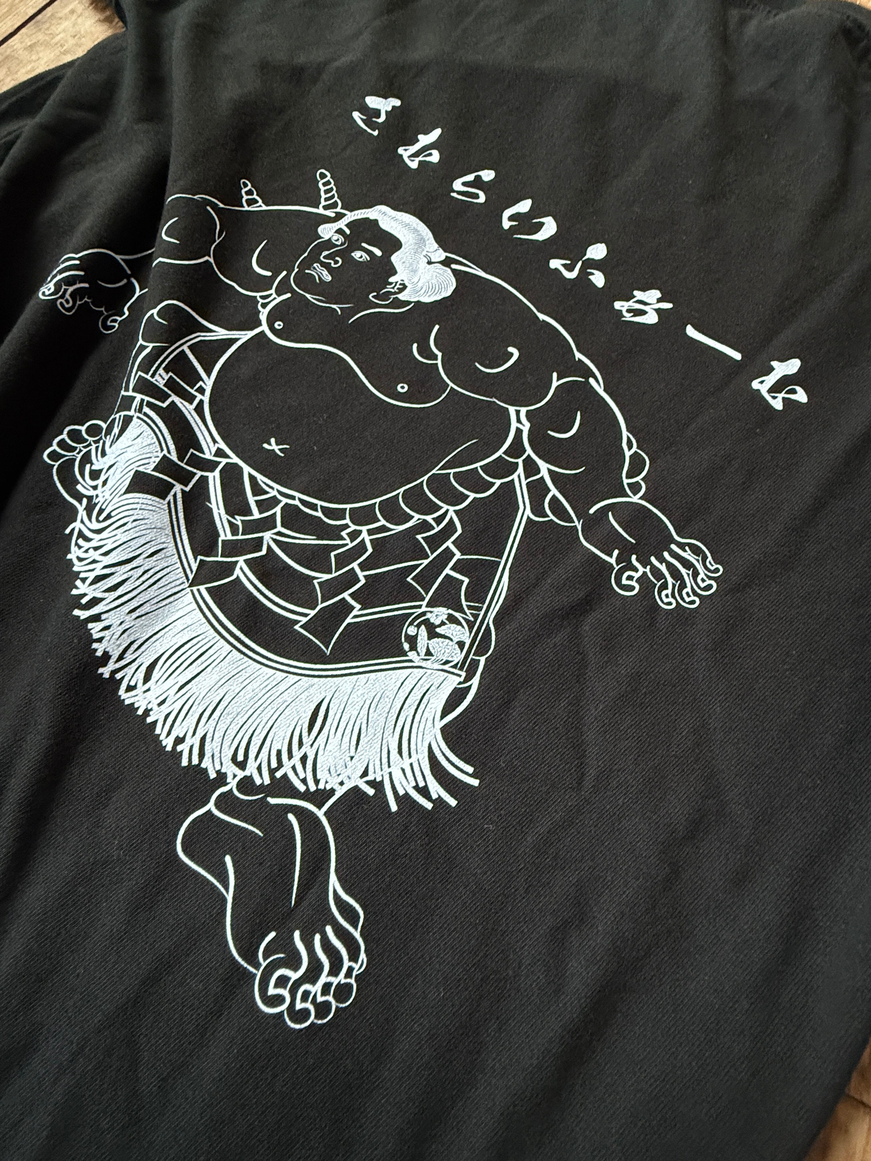 背中に白抜きの相撲ロゴ(化粧まわしにさりげなくSAMURAI FARMロゴを入れました、右袖にSAMURAI FARMと文字のプリントが入ってます。
