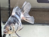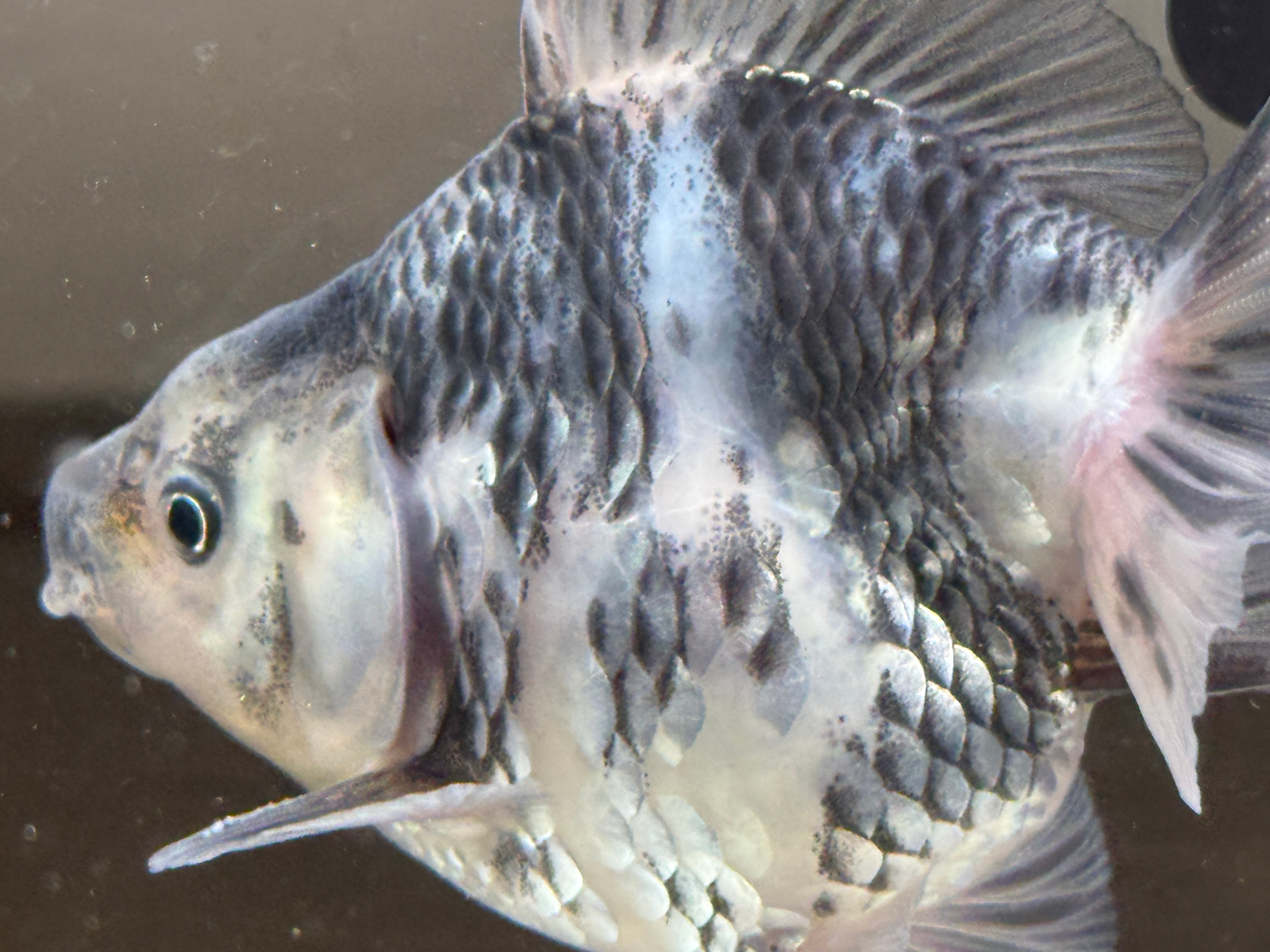 さらに畳み掛けるような美しい銀鱗を携えた墨と浅葱と白のグラデーションでゼブラを表現しております。そして何よりもしっかり開いたドレープの乗った尾鰭は大変美しいローズテールになると思われます。