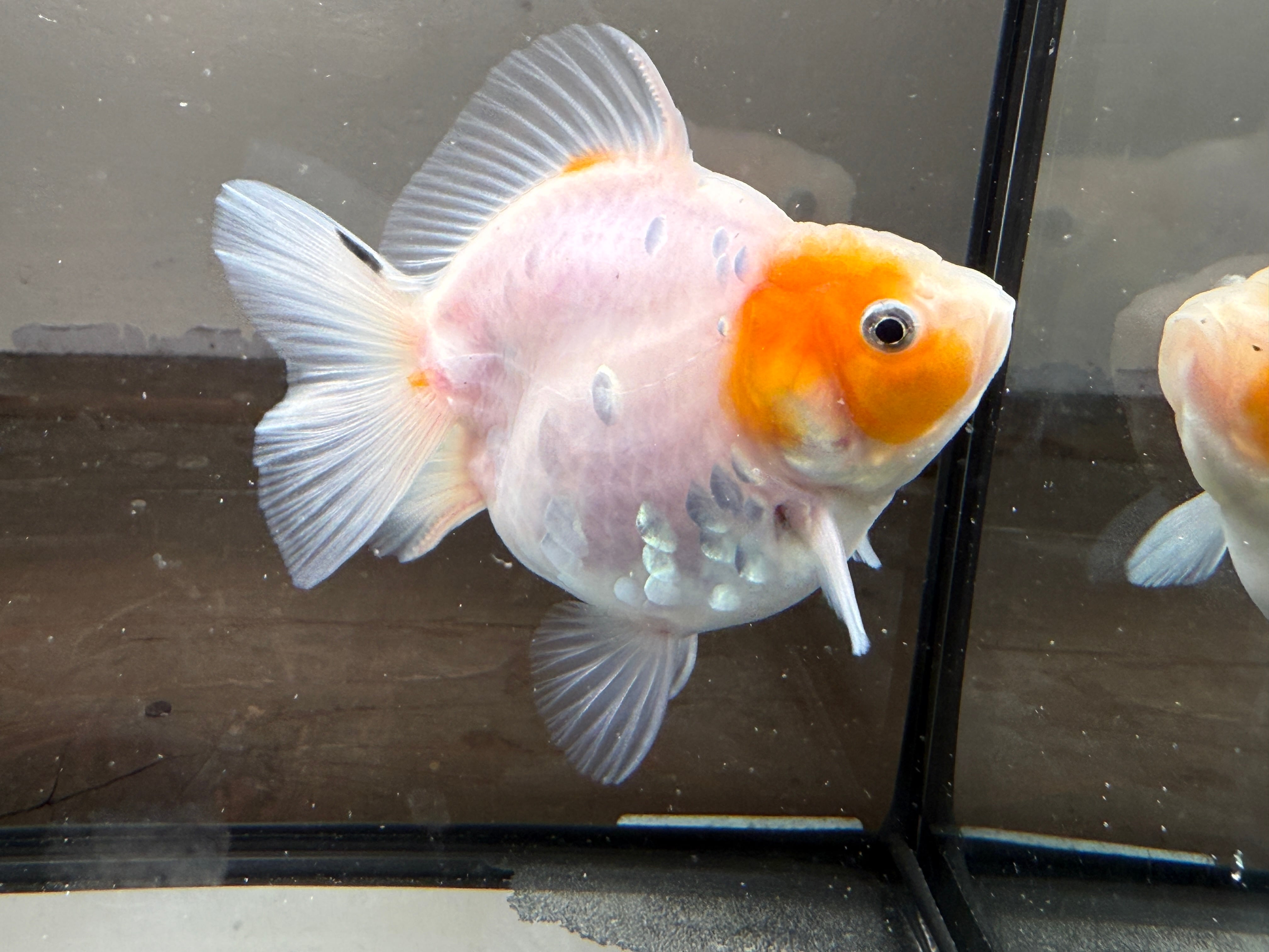 白勝ちの桜達磨に光沢鱗のドラゴンスケールが左右共に数多く散りばめられており、アシンメトリーな左右の桜の入り方と相俟って大変美しい一匹です。すでに大柄ですので、今後の育て方次第で大きく育ちそうです。大きく育てることができればさらにこの美しい銀龍鱗を楽しめそうです。