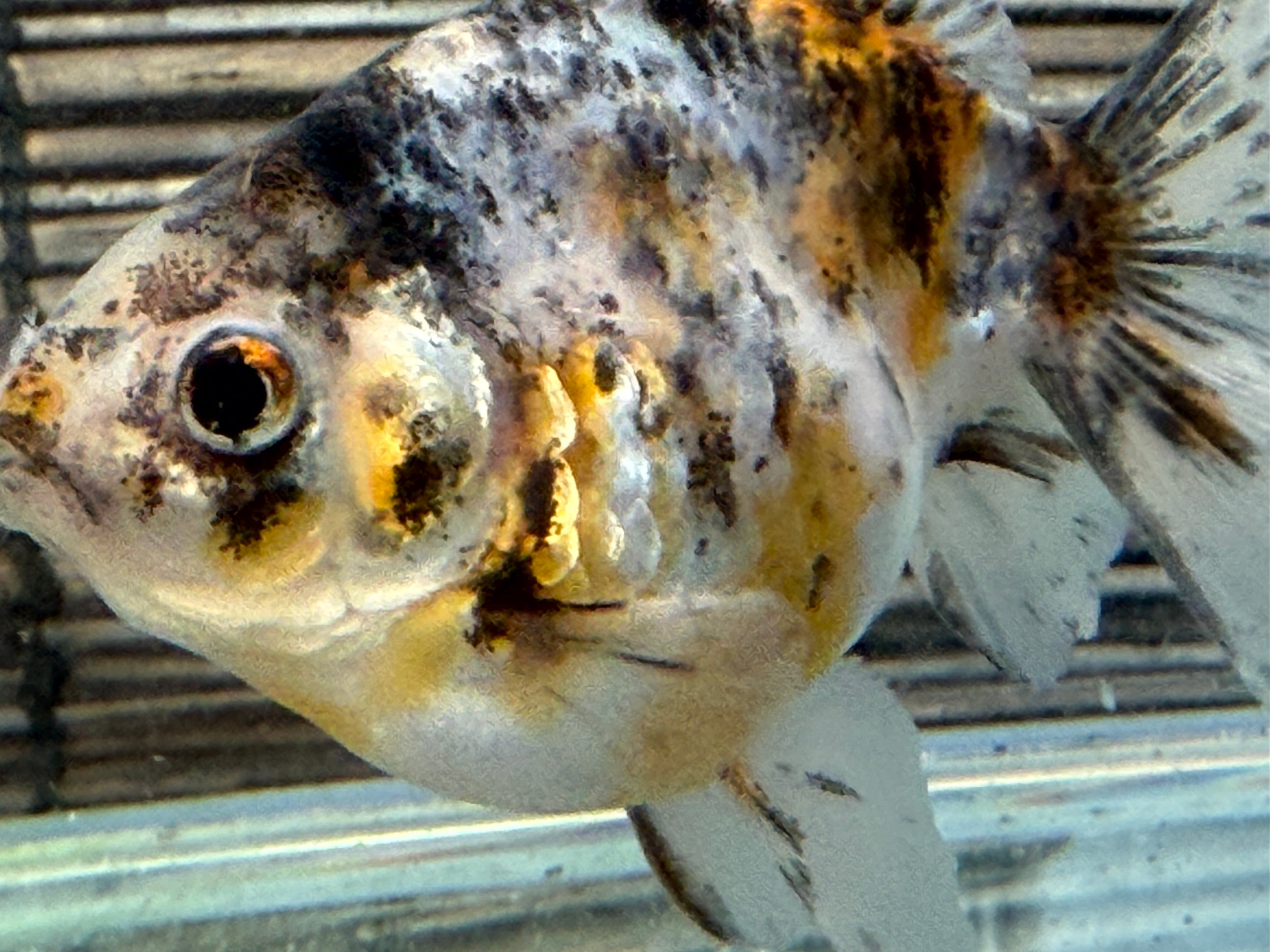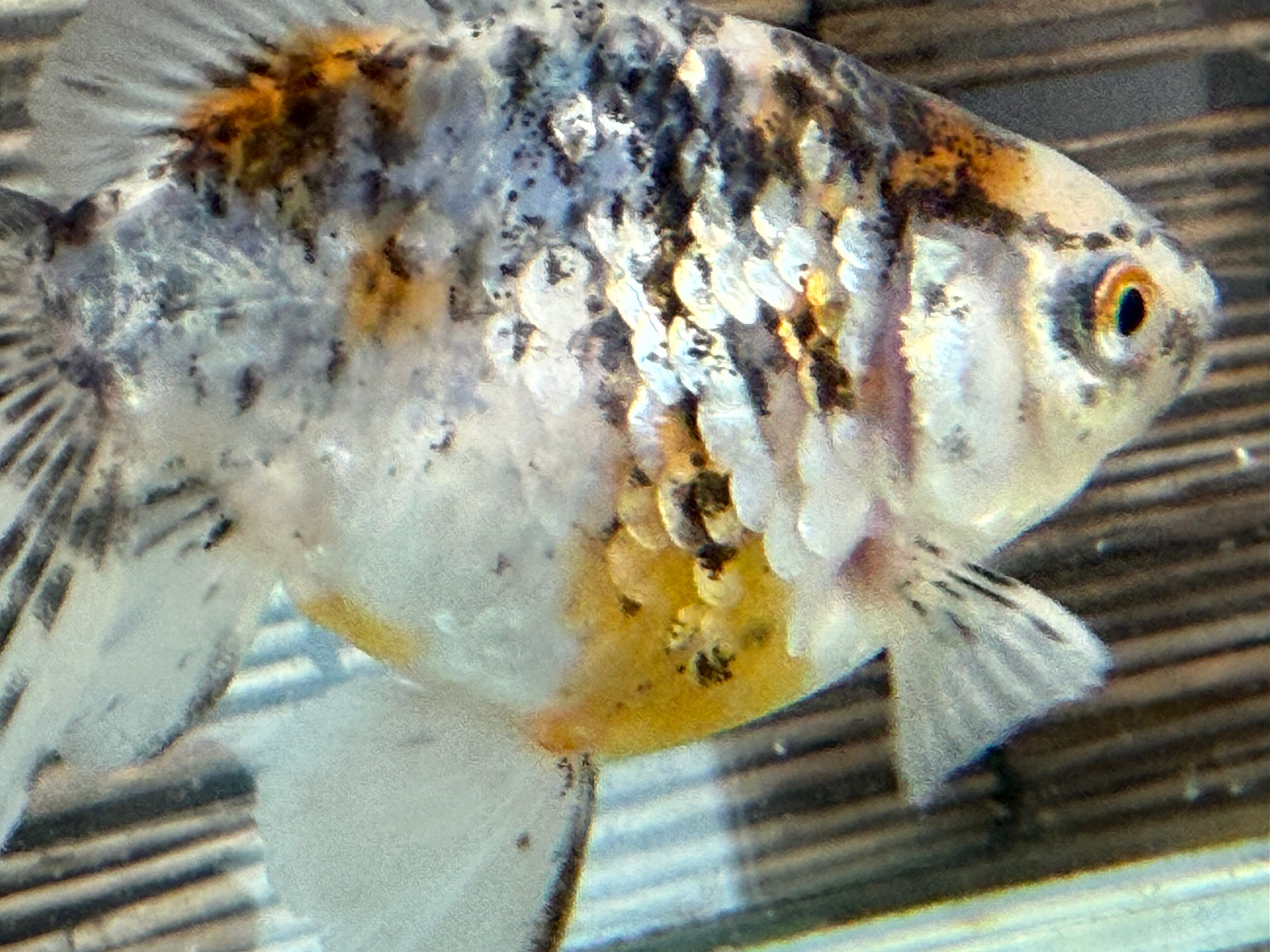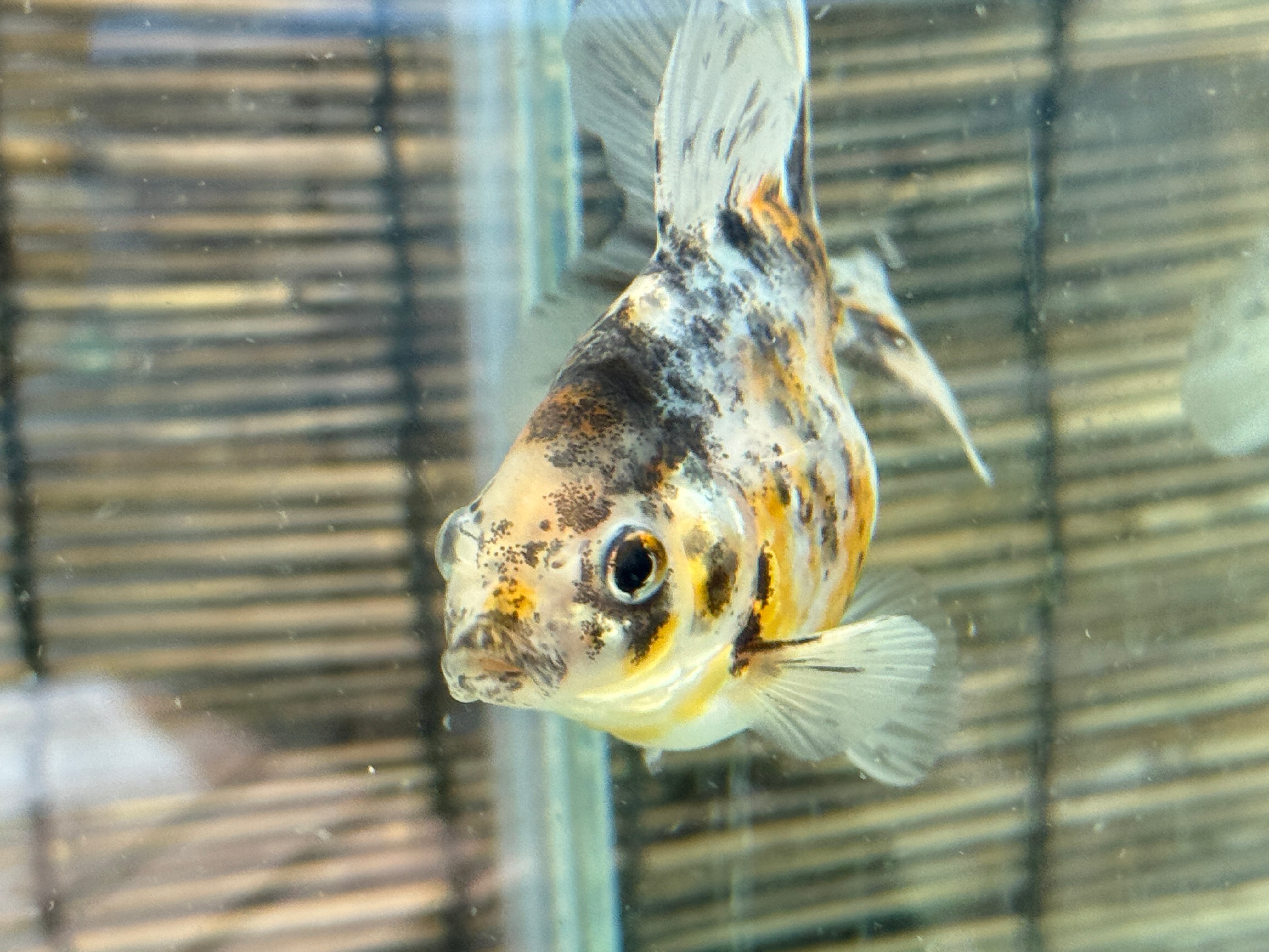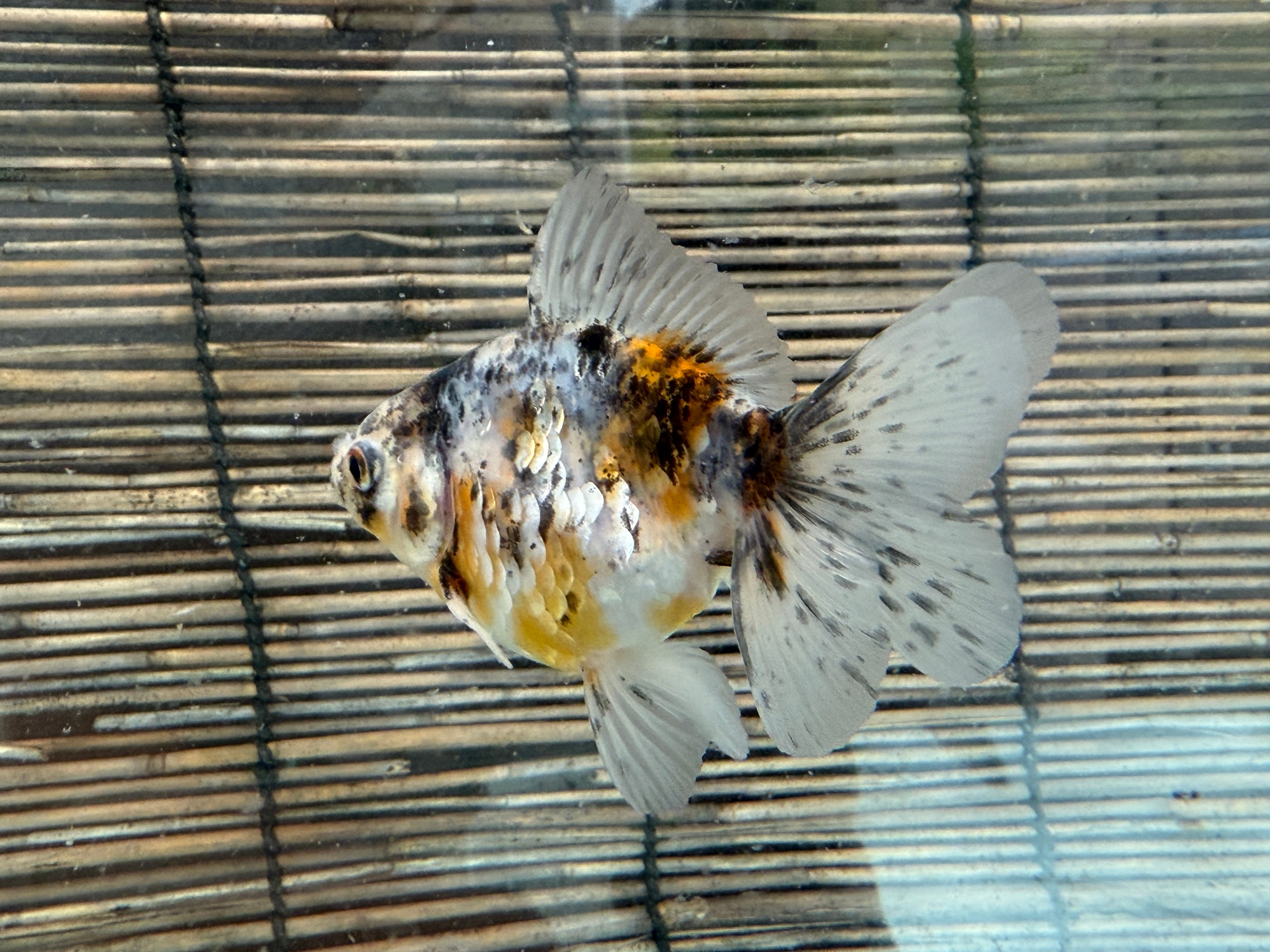 大変美しく細かく入るキャリコの体色と銀鱗が非常に美しく、大きなローズテールが大変優雅です。尾に散る墨のバランスまで計算されたかのような美しさ。