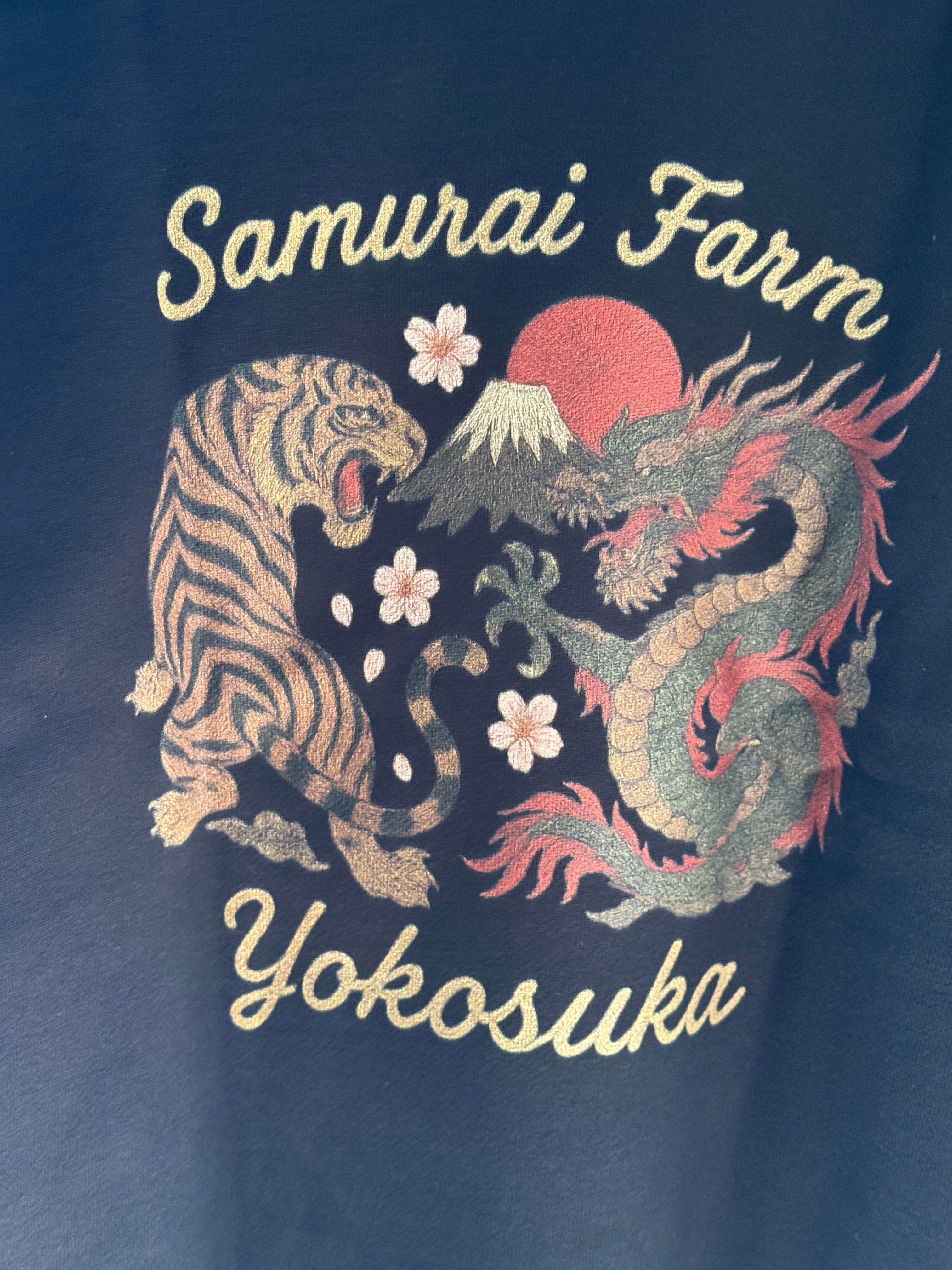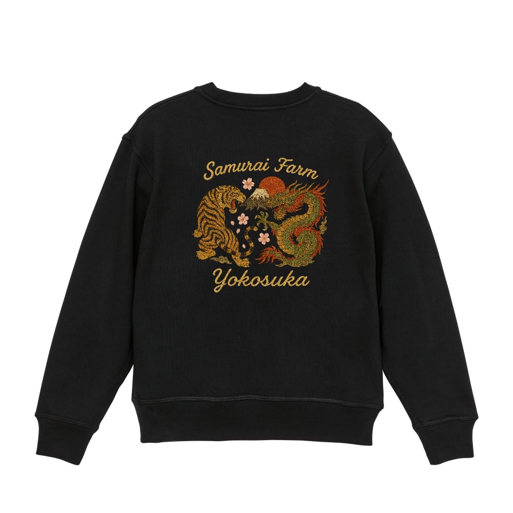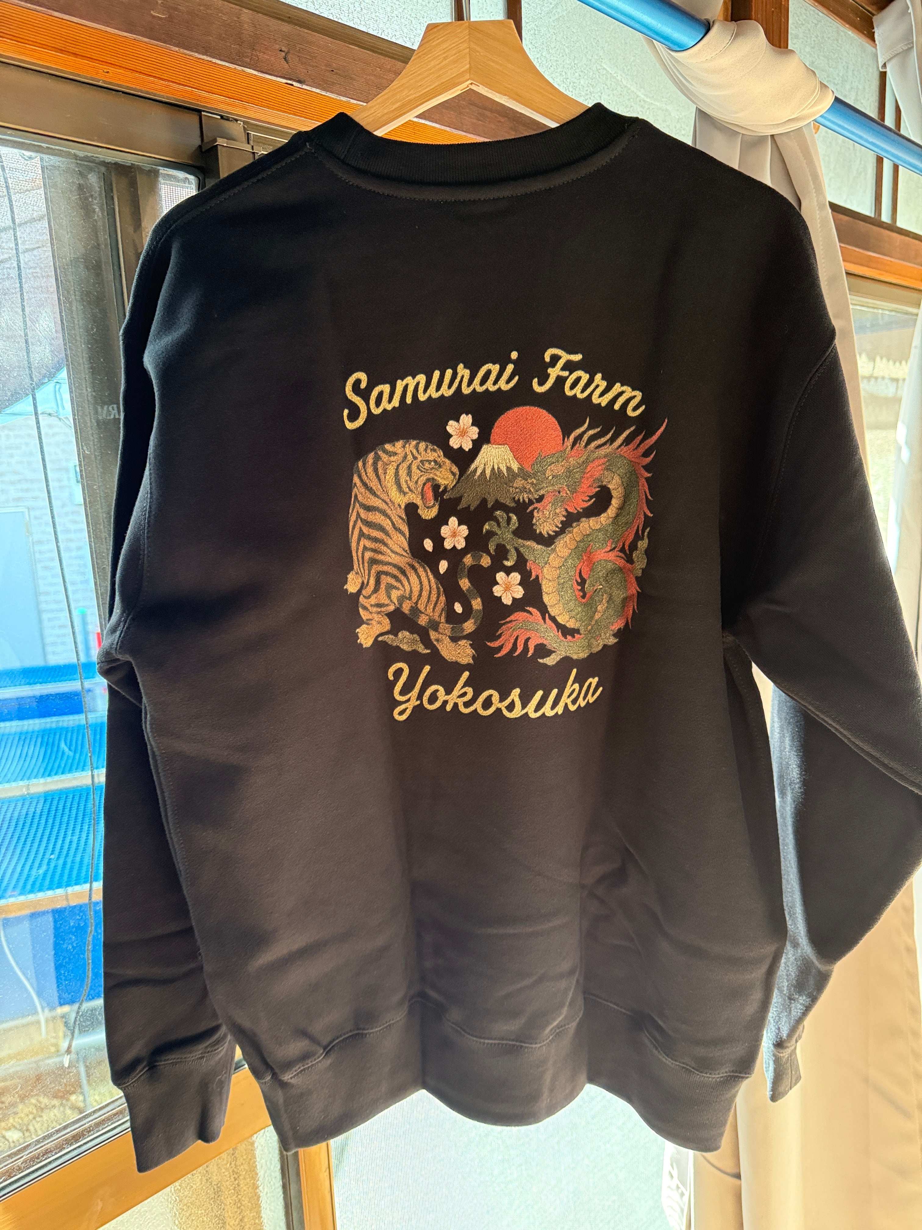 SAMURAI FARMの地元横須賀のスカジャンとSAMURAI FARMを代表する金魚の品種である虎龍をイメージしたスウェットシャツ。背中で睨み合う虎と龍に富士と太陽、桜が刺繍風プリントで描かれています。前面左胸にSAMURAI FARMのロゴが入ってます。