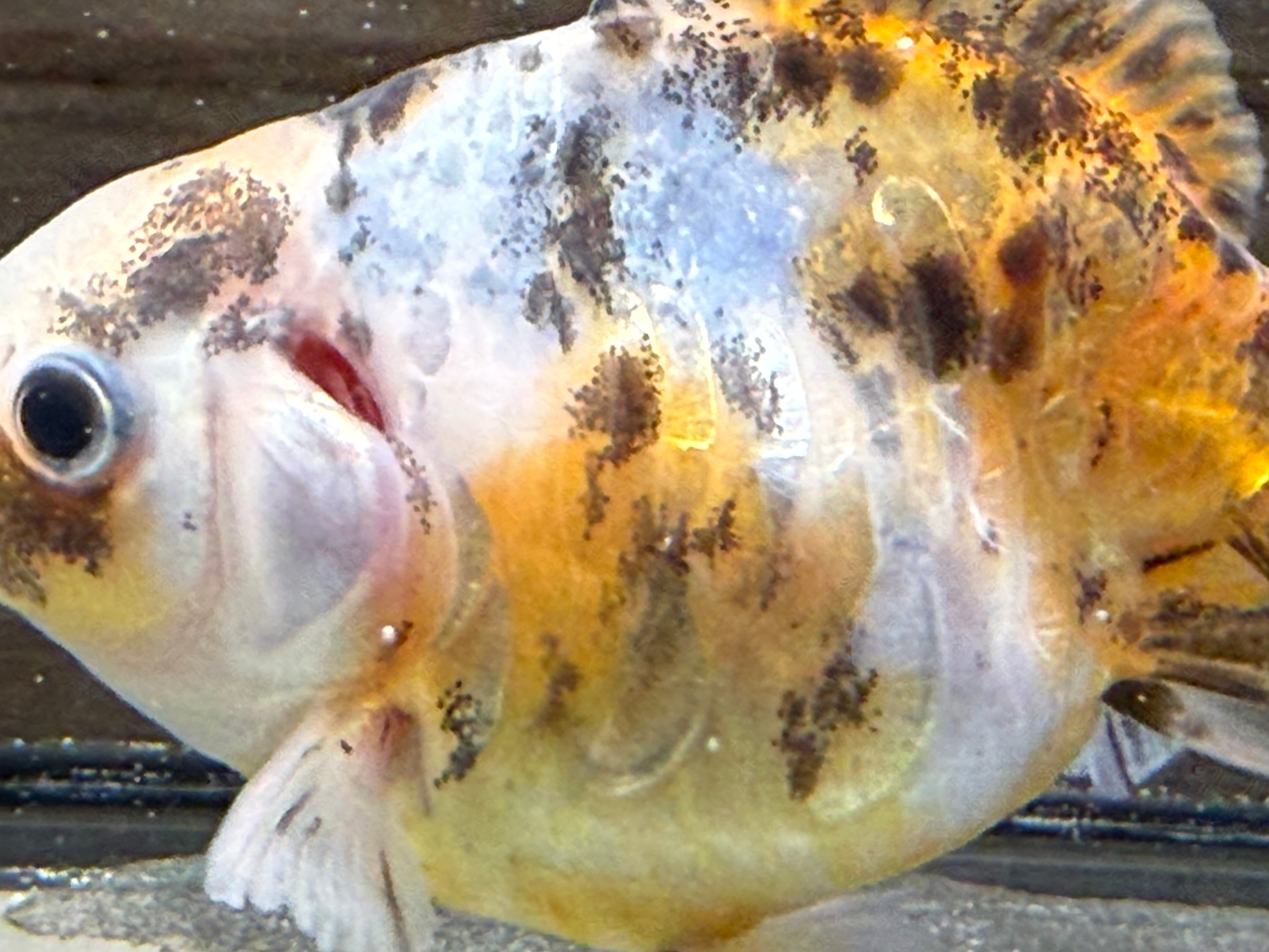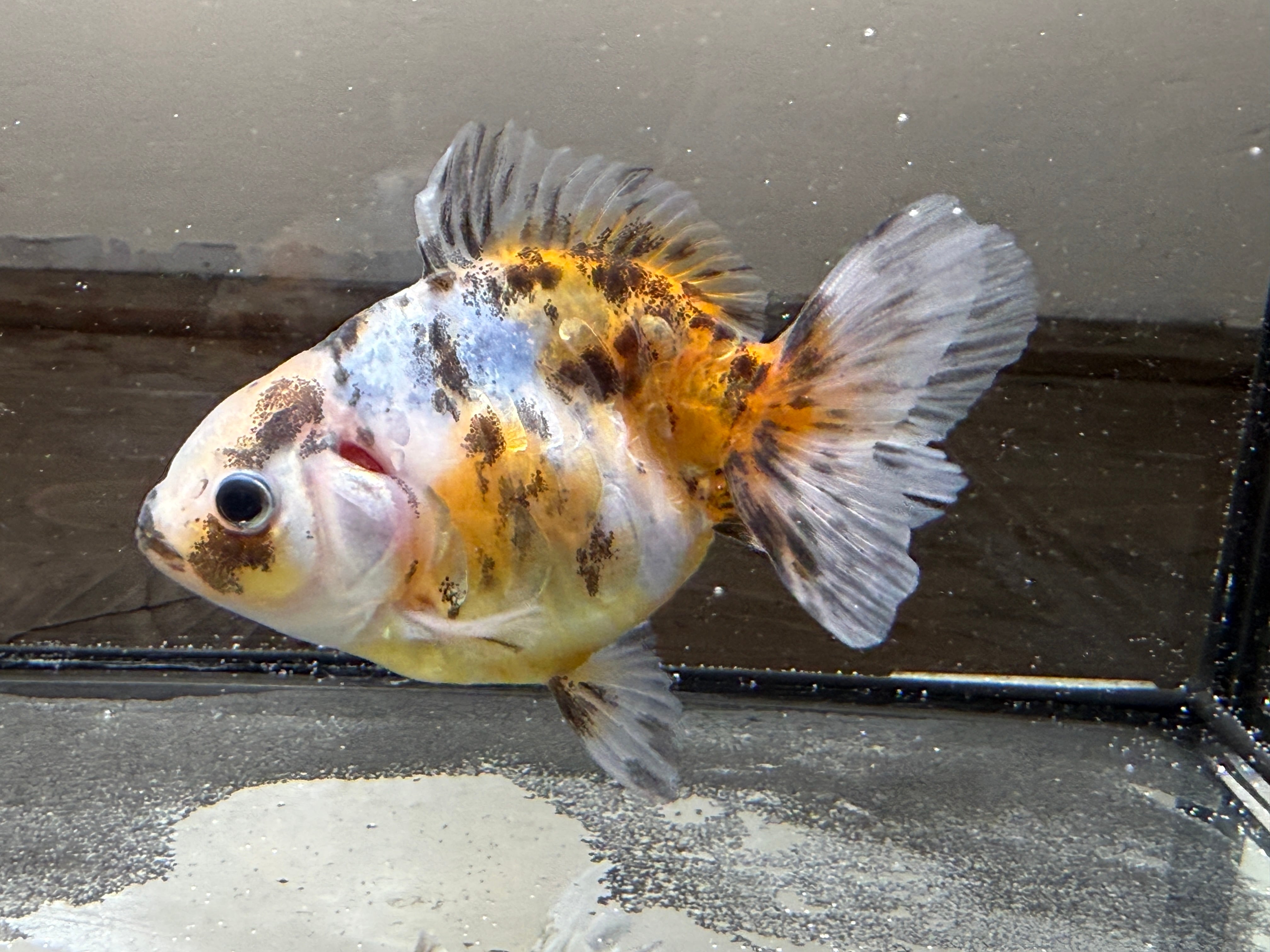 非常に鮮やかで鮮烈な浅葱とオレンジがバランスよく配置された体色に非常に大きなドラゴンスケールが最高にクールです。SAMURAI FARMでは最高にクールなんて言葉は使わないのですが、この金魚に関しては他に言葉が見つからないくらい最高にクールです。