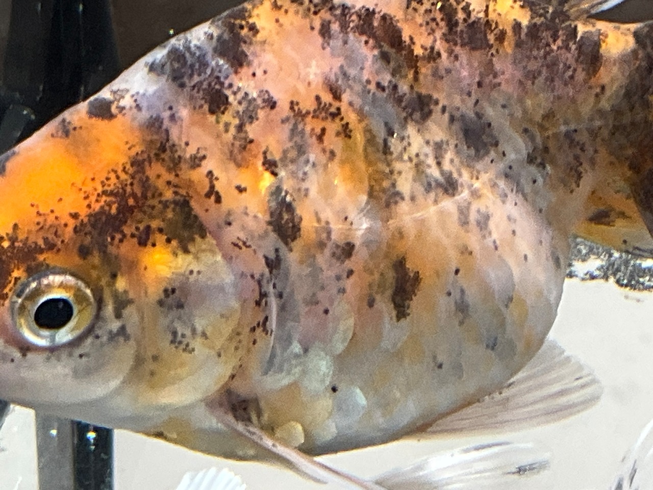 ところどころ入る雪の様な白と墨と茜色の入り混じる中銀鱗がキラキラと光る美しい1匹です。