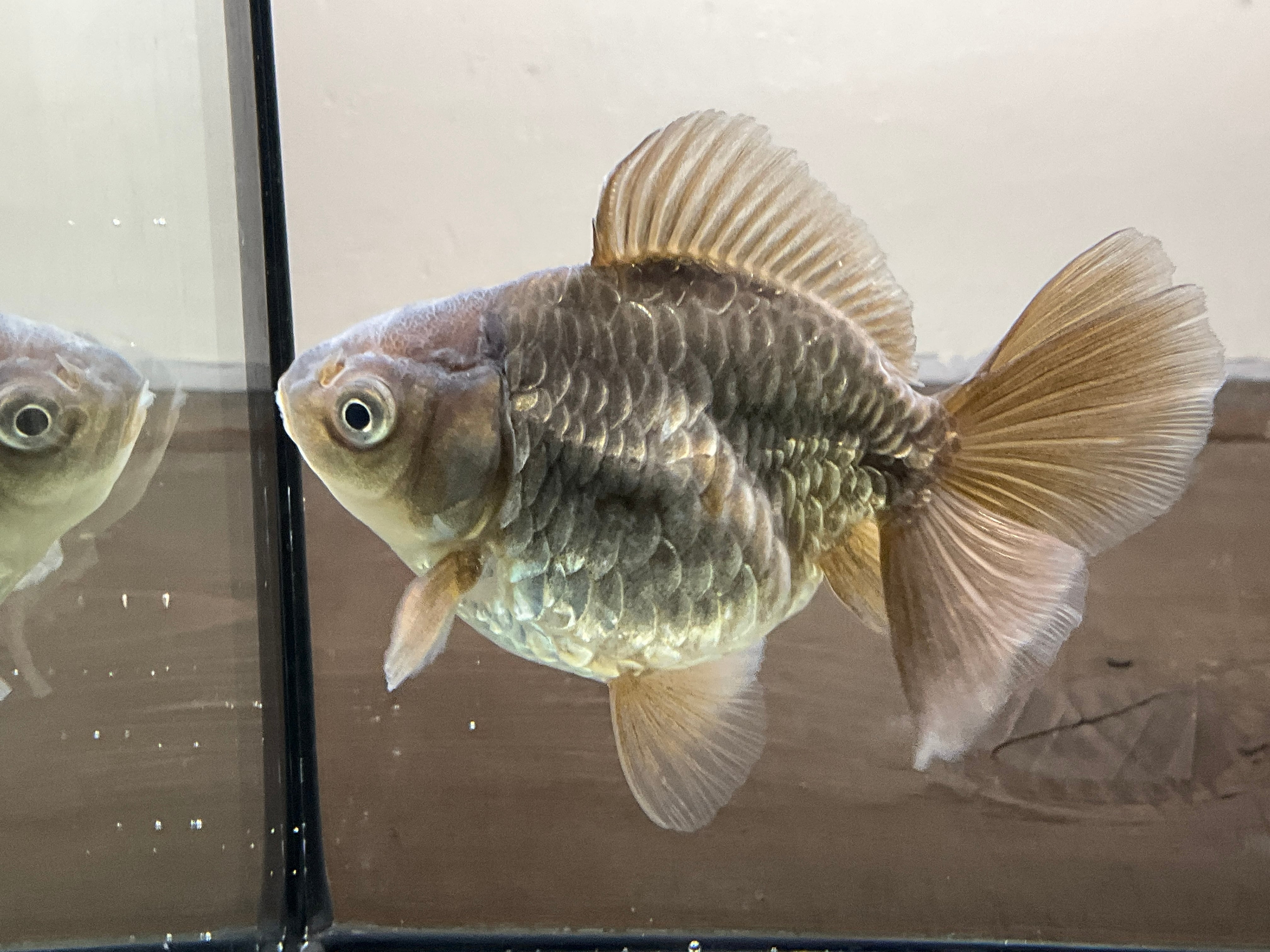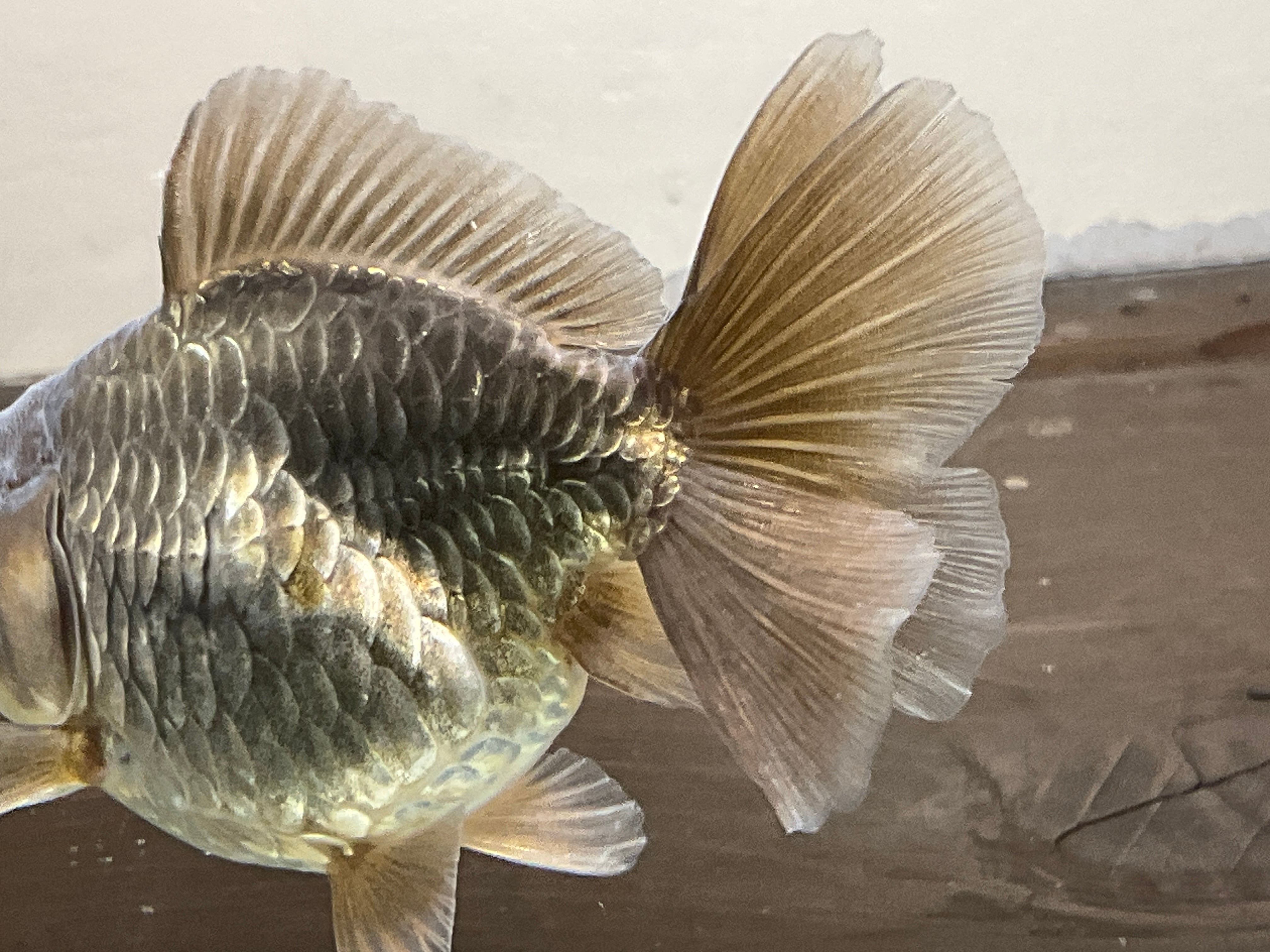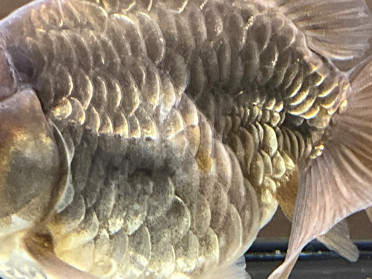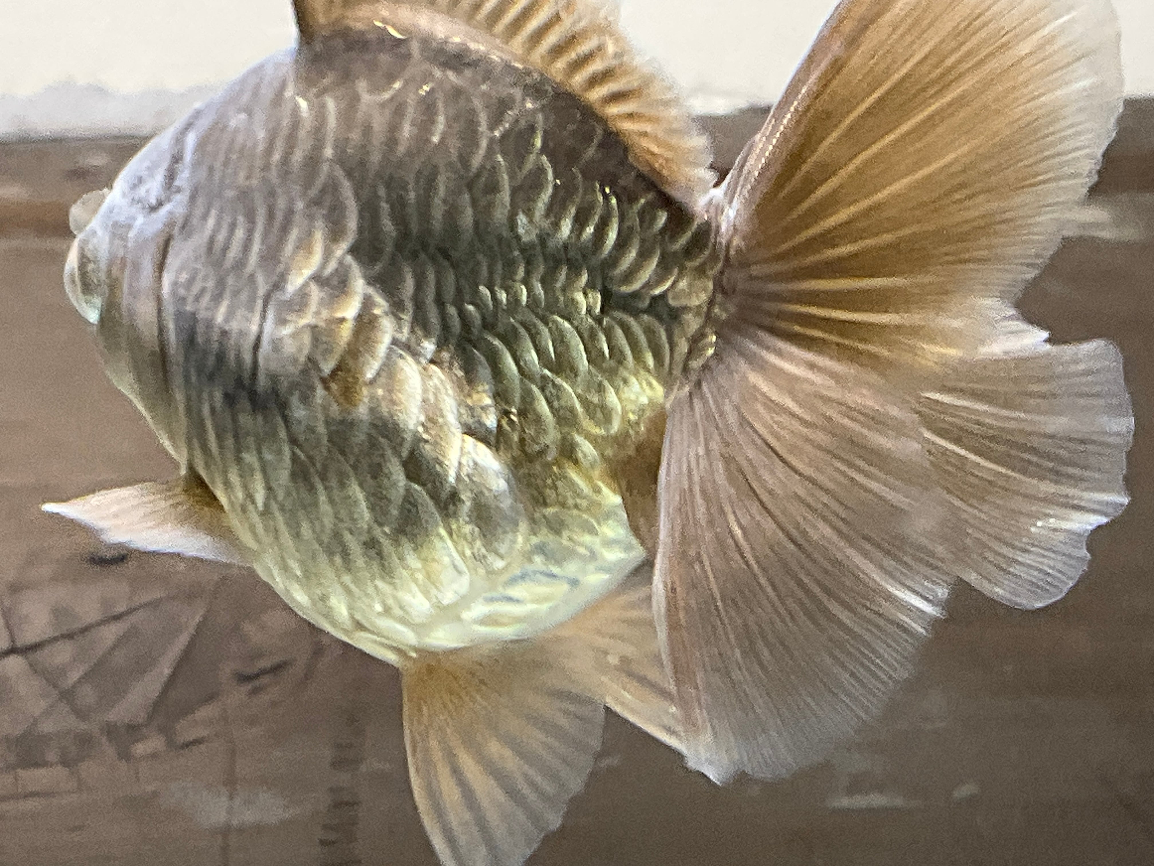 大変形の良い丸手の茶龍です。尾が大変良く開いており上下の長さも揃っており大変美しくドレープが入っております。しっかりした大きさのドラゴンスケールが美しく光ります。