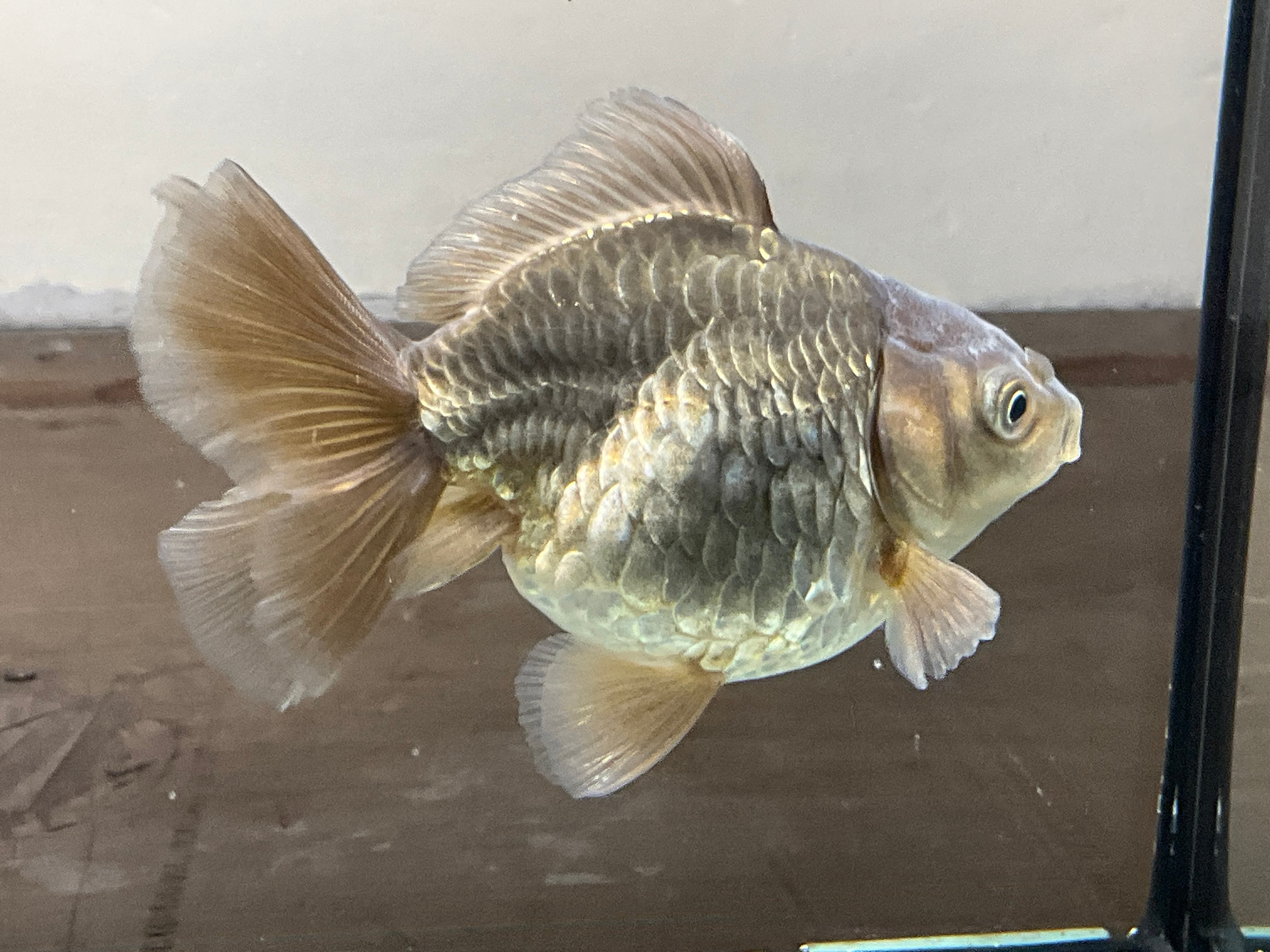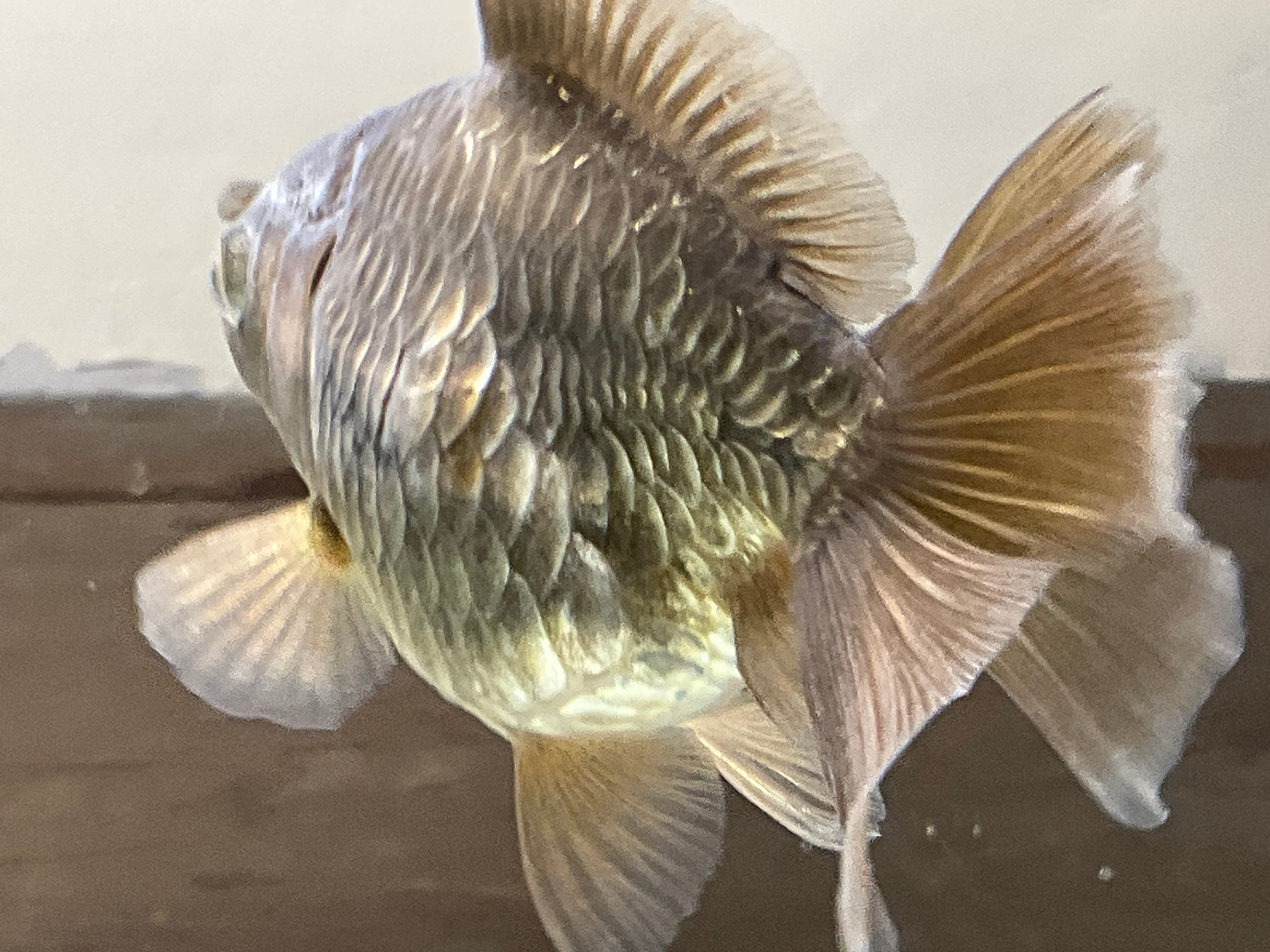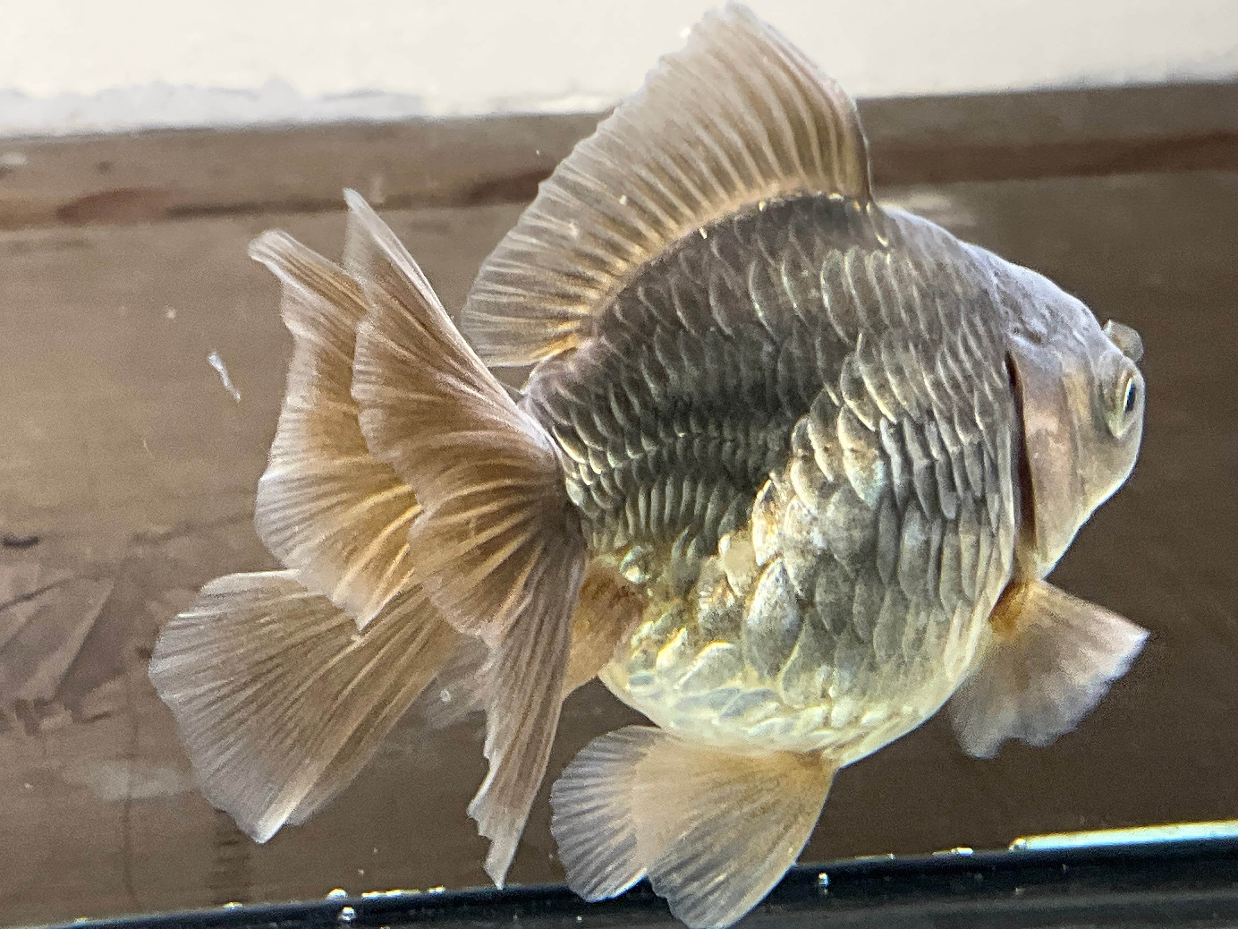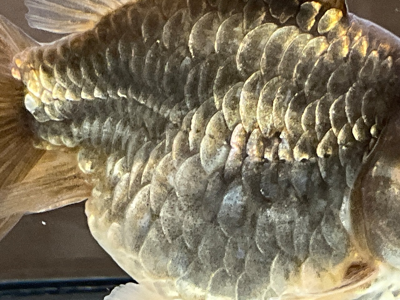 大変形の良い丸手の茶龍です。尾が大変良く開いており上下の長さも揃っており大変美しくドレープが入っております。しっかりした大きさのドラゴンスケールが美しく光ります。
