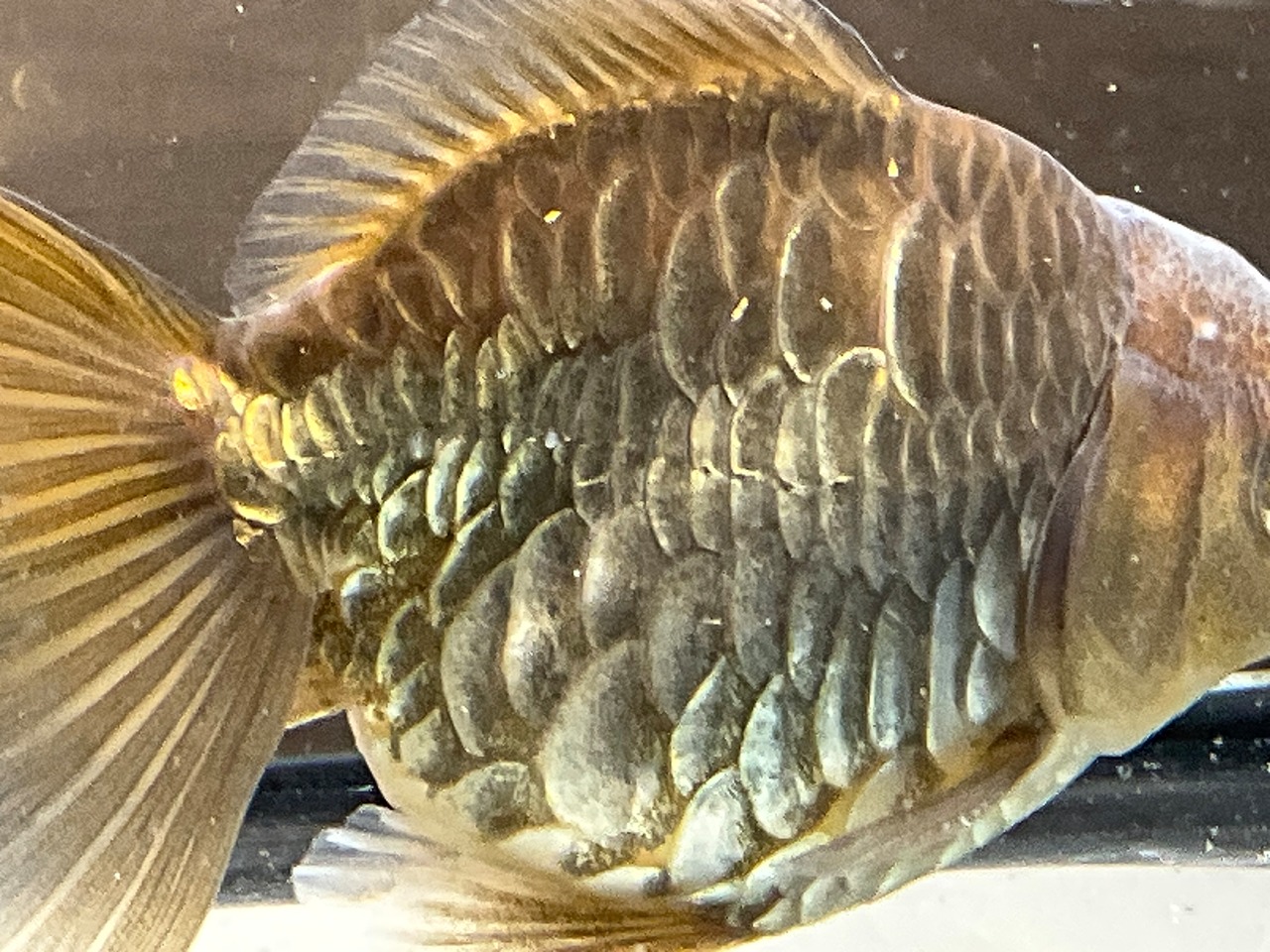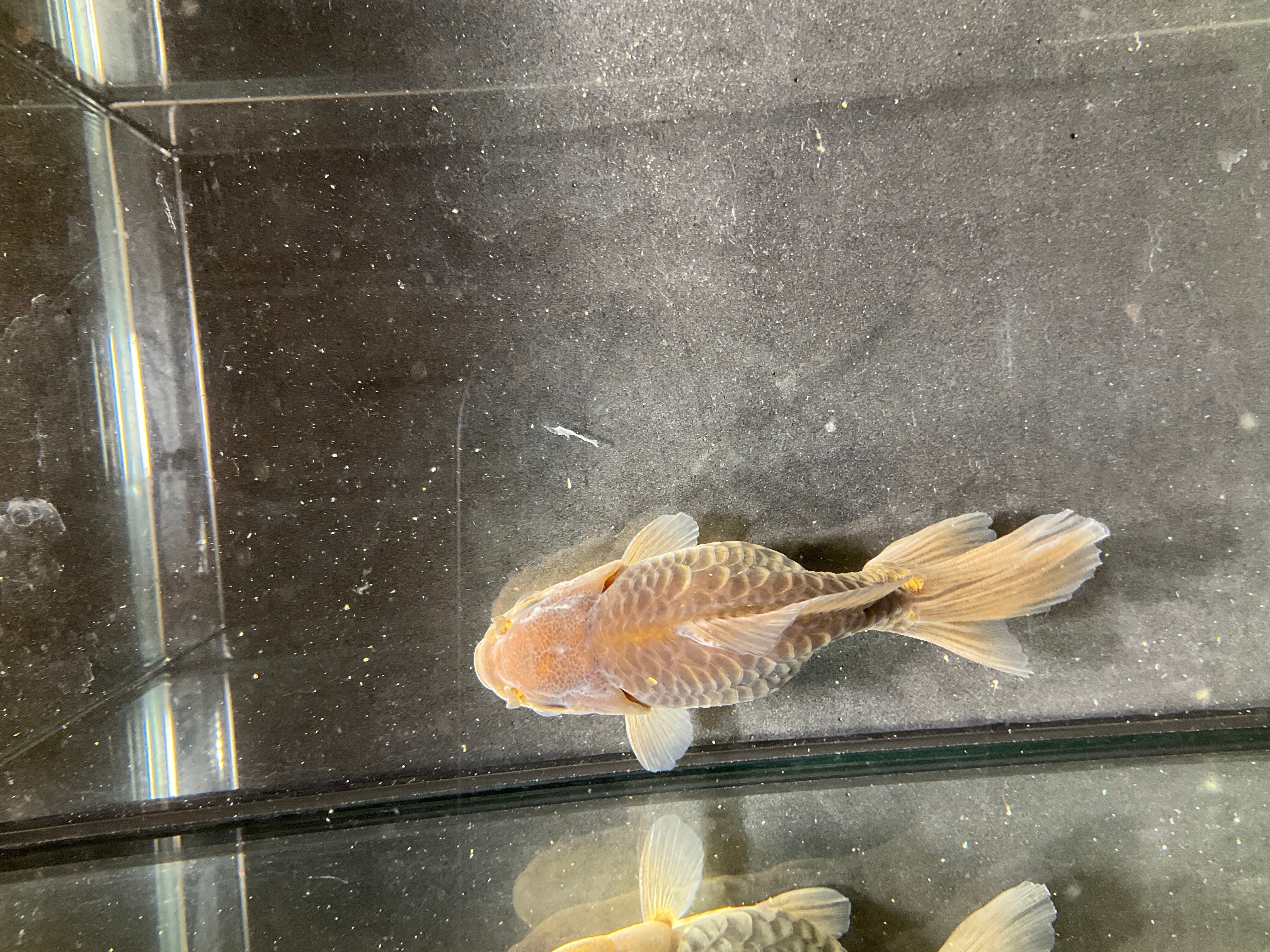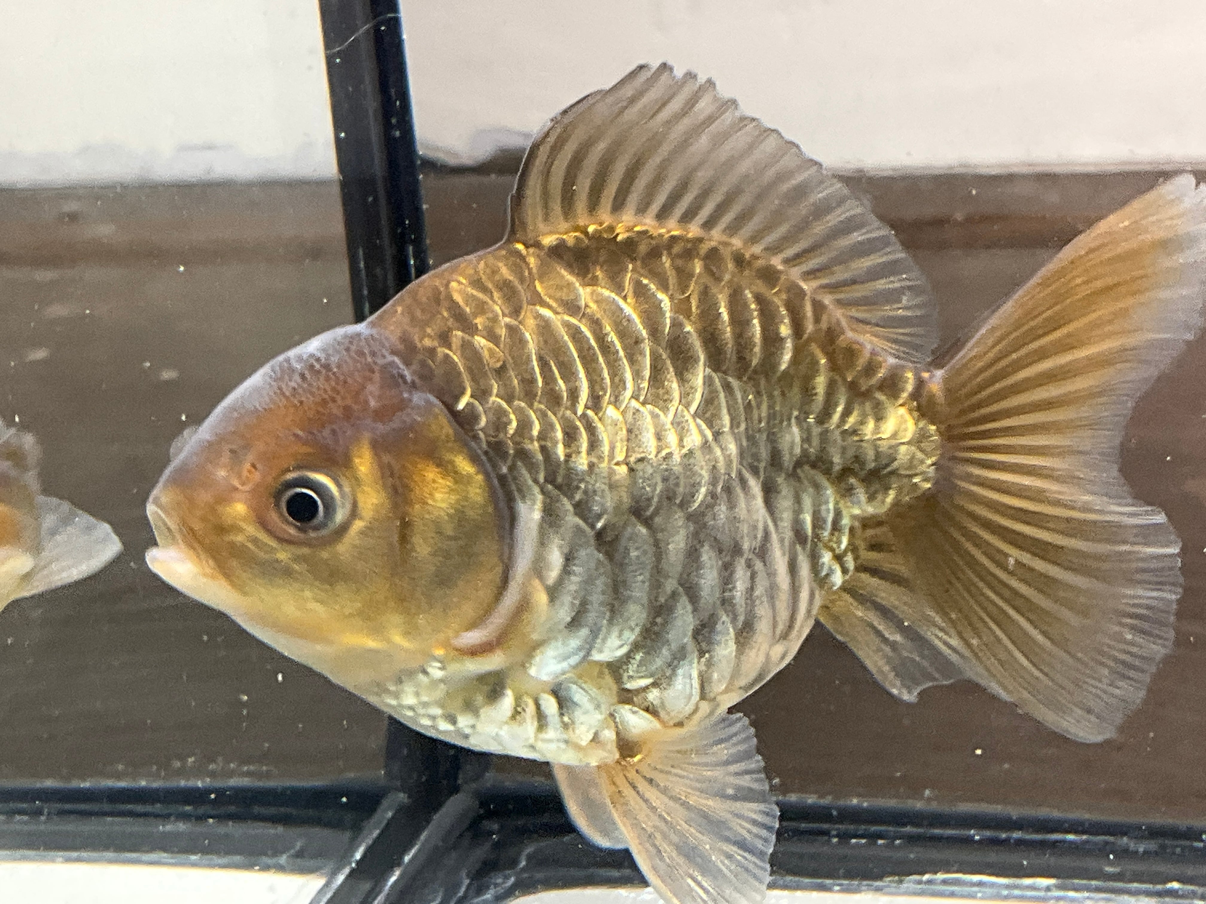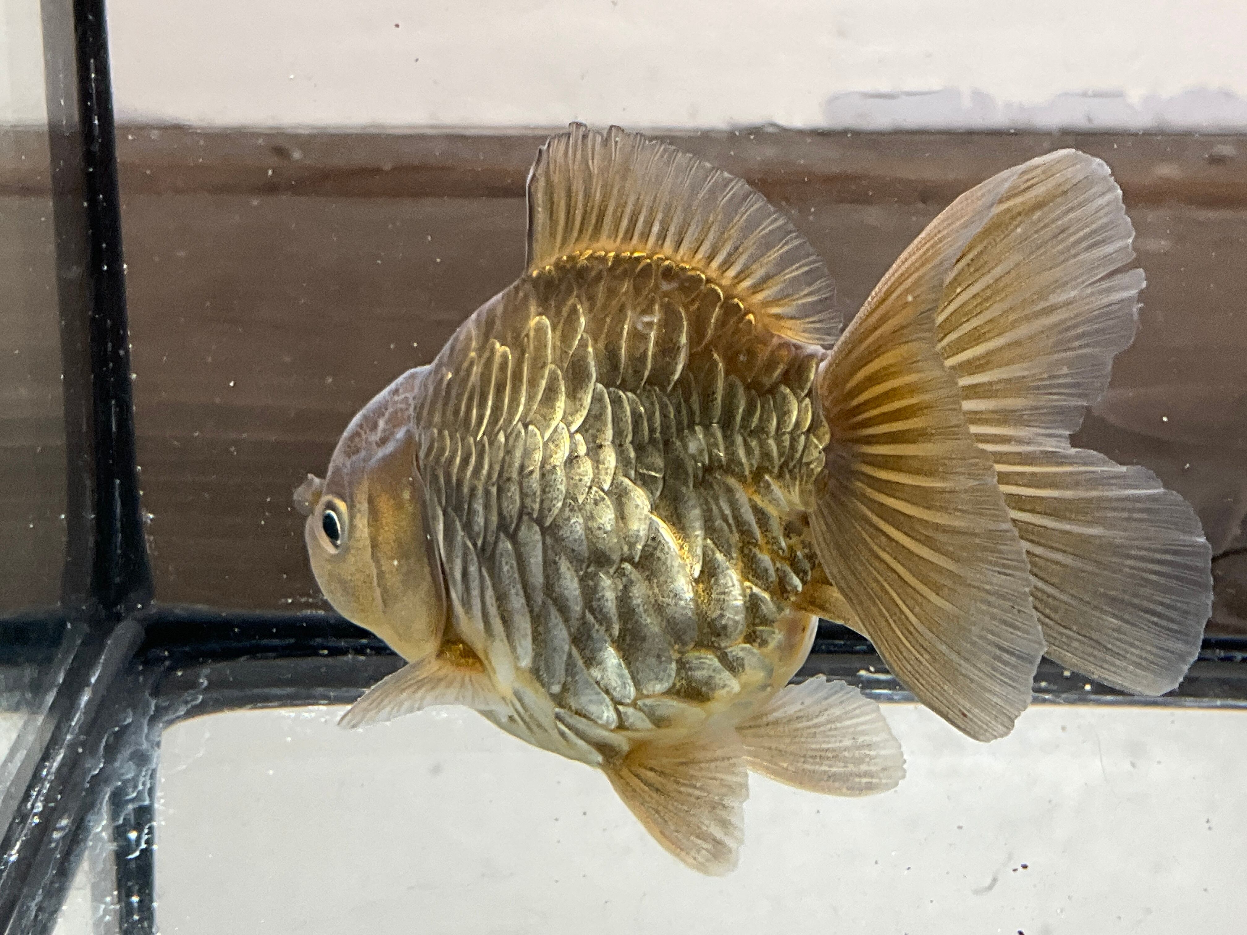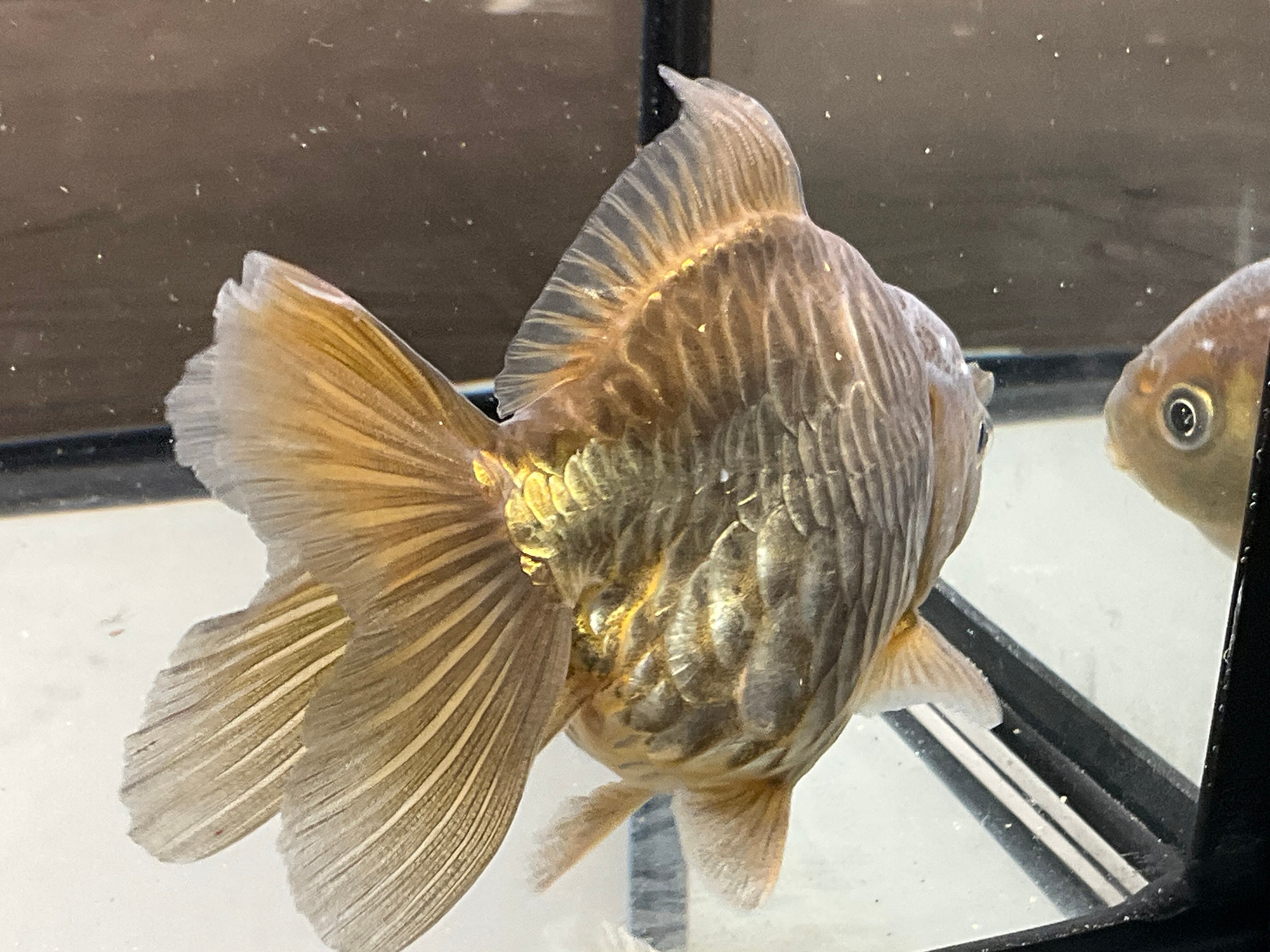 体格も非常に整っており三尾ですが大きく広がった尾鰭、茶龍特有の渋い金属光沢感が合わさり非常にカッコいい一匹となっております。