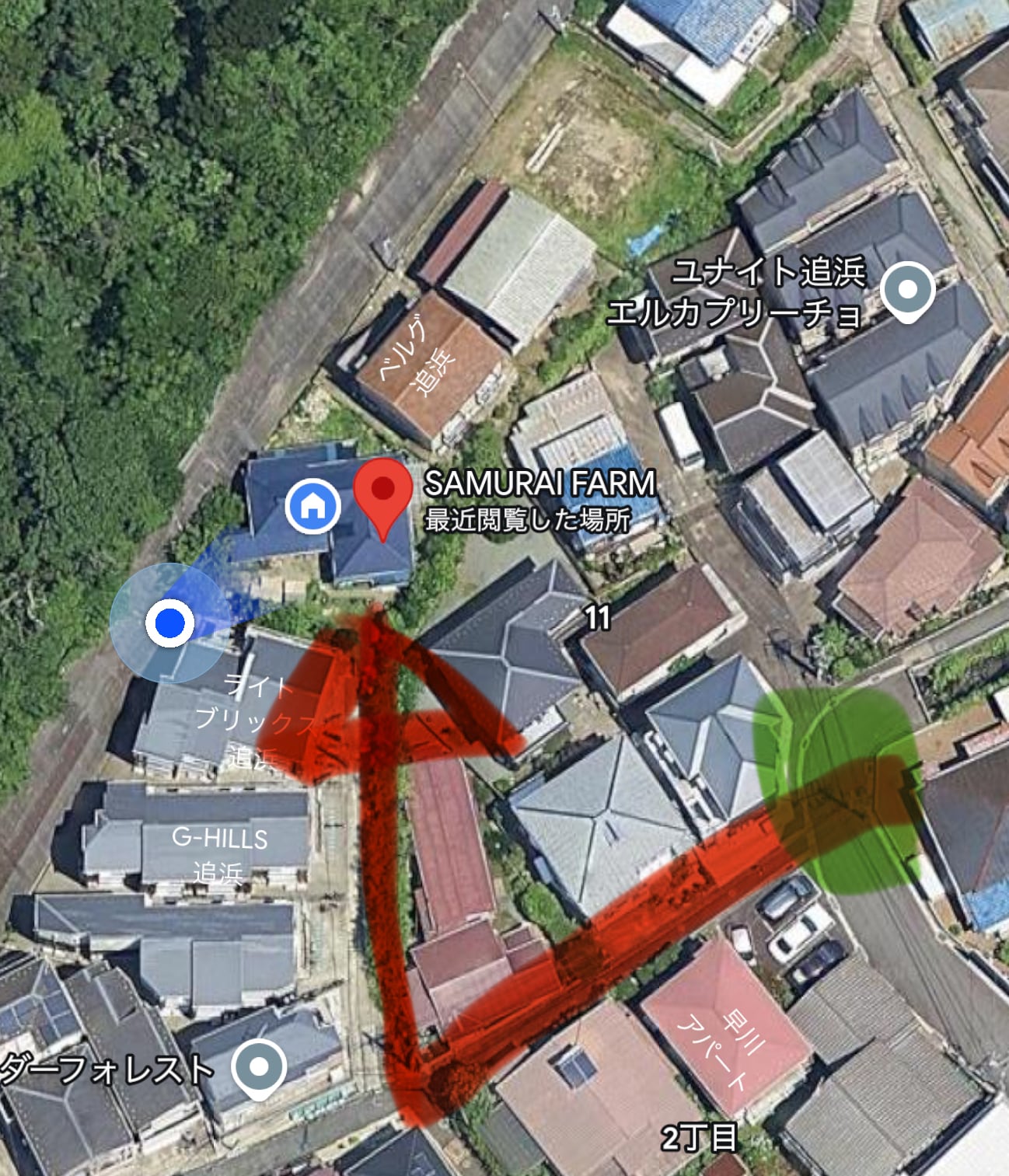 大体みなさん緑の場所まで来られてお電話いただきますので、そこから地図上での道を書いておきます。右に曲がる際に小さな階段があります。